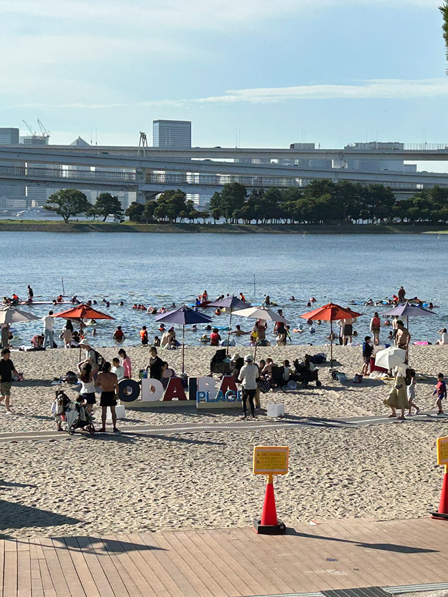 降雨後における台場周辺海域での大腸菌濃度を予測するために、大腸菌流入防止対策(水中スクリーン)を考慮した沿岸海域水位水質予測モデルを用いて、お台場海水浴予報システムを構築する。