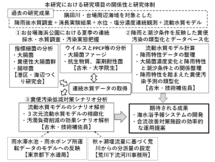 海水浴イベントを開催しているお台場海浜公園を対象として、雨天時越流水に伴う糞便汚染を予測して、水浴に伴う健康リスクを管理するために必要な科学的な知見を提供することである。まず、過去に蓄積した降雨後水質調査データに加えて新たな入手する連日採水調査データを活用して、越流水汚濁負荷量の時空間分布を反映可能な3次元流動水質モデルの検証を充実させる。そして、降雨特性に基づいて類型化された降雨タイプ別に、お台場海浜公園おける大腸菌等の濃度変化のデータベースを構築する。これにより、発生降雨の特徴から降雨タイプを同定して糞便汚染状況の予測を行うことで水浴の可否を判断するシステム構築に貢献する。また、合流改善対策としての高速ろ過処理や雨水滞水池などの施設やグリーンインフラなどの雨水流出抑制施設の導入による汚濁低減効果を定量評価する。加えて、導入された施設を降雨特性に応じて効率的に運用する手法を検討する。