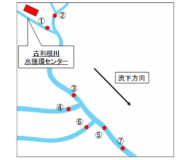 夏季(7月)冬季(12月)に、下流から古川橋〜万願寺橋〜和土橋〜中落堀川(運動場前)の順に「水辺のすこやかさ指標」による川の観察・評価を行うと同時に、図1に示す地点で河川水サンプリングを行い、パックテストによる水質測定(COD、BOD、N-NH4+、N-NO3-、PO4-)、透視度計による透視度、測器によりDO、ORPを測定した。また、エッグマンパージによる採泥を行い、MPsの定性分析用のサンプルに供し、「ぷらウォッチ」によるMPsの定性分析ならびに定量分析を行った。