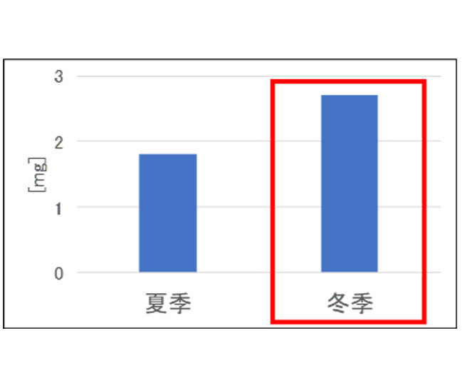 定量分析は、夾雑物を除去した後、酸化処理により有機物を分解し、比重分離法を用いてMPsを分離した。地点別の河川底質5g(dry)あたりのMPs存在量を図3に、季節別のMPs存在量を図4に示す。地点②③は流速が低いこと、冬季は流量が減少することから、MPsが沈殿・滞留しやすいことが考えられた。 -