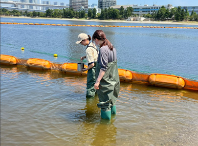 お台場海浜公園での降雨前後にける糞便汚染実態を調査するために、図2に示すようにお台場プラージュの期間に設置されるフロート型のスクリーン内外で、写真1のようにステンレス容器を用いて表層採水を実施する。